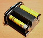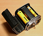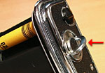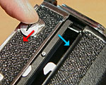 To remove the magazine from the camera body, make sure that the dark slide is completely inserted into the magazine, then slide the silver button at the top left of the magazine to the right (red arrow). The magazine will be released from the camera body. |