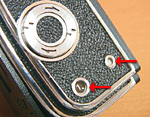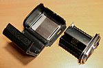 To open the magazine for loading, you will find a small circular latch with a small plastic lock tab on it on the upper right hand side of the magazine. Rotate the plastic tab counter-clockwise and hold it there, while pressing the chrome latch to the left to open the back. The door will spring open, and the film insert can be lifted out. |