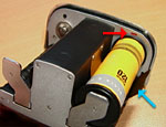 The roll of film must be inserted into the side of the magazine that has a small red mark on the side of the spool chamber. This mark will be important a bit later. Remove the paper band from the film completely. Pull back on the metal arm that will hold the spool in place, insert the fresh roll of film. Be sure that the leader is coming out from the bottom of the spool (blue arrow), and swing the arm back up to engage the film spool. While doing this, make sure the paper stays tightly rolled to prevent light from fogging the film. |