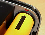 Make sure that the camera's shutter is cocked, indicated by a white indicator in the small window located on the lower right side of the camera body, and install the magazine onto the camera body. It is important to make sure that the both the camera body and film magazine cocking indicators are white prior to installing the magazine to avoid "confusing" the frame counter and losing one or more frames of film. Remove the dark slide and insert it into the holder on the back of the magazine (red arrow), and you are ready to shoot your first picture. It is also helpful to tear one end off the film box and insert it into the back of the film magazine. (blue arrow) This way you will know what kind of film is loaded in it. |