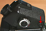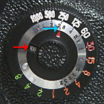 Start turning the big dial on the righthand side of the prism either way until you've got both arrows lit up. Note: Sometimes it's hard to get both arrows to light up simultaneously. If you can't get them both lit, just find the point where turning the dial a tiny bit will light up either arrow alternately. That should be your correct exposure point. Again, the meters are uncoupled and the cameras are purely mechanical - So there's no way for the meter to tell the camera what the proper exposure is, nor is there a way for the camera to automatically set its shutter speed and lens aperture. So, next take your eye away from the finder and look at the dial on the righthand side of the prism again. (By the way, it's a good idea to make sure that when you were rotating that outer ring, the inner rings didn't shift either. If they did shift, reset them to their correct positions without disturbing the outer ring.)