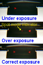 In the next picture (below-right), the yellow arrow in the center image (for "Over exposure") points to the Spot indicator. If this little circle is on, you're in Spot mode. If it's not on, you're in center-weighted mode.